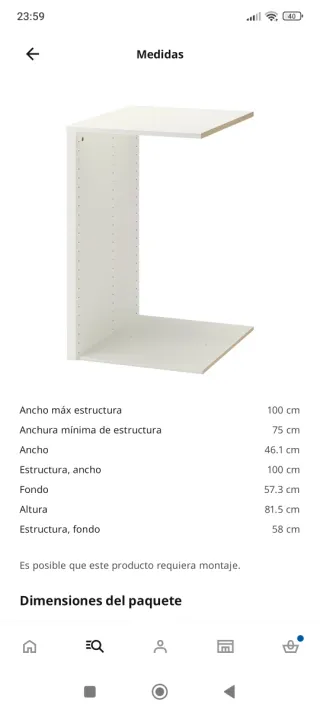 Estructura de armario de Ikea. Ahora desmontada. +1 balda en medio de 75x58 y otra mas abajo tapando la cajonera. (Desmontadas) +2 cajones completos. (Montados). Guias cajones incluidas. Sin puertas.