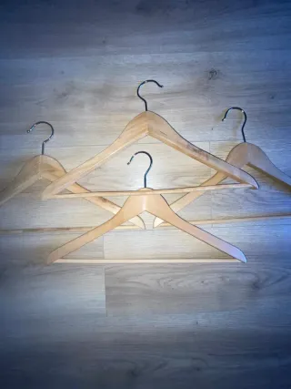 Pack de 56 perchas de madera de Ikea. Perfectas para organizar tu armario. - Diseño clásico y funcional. - Barra inferior para pantalones o faldas.