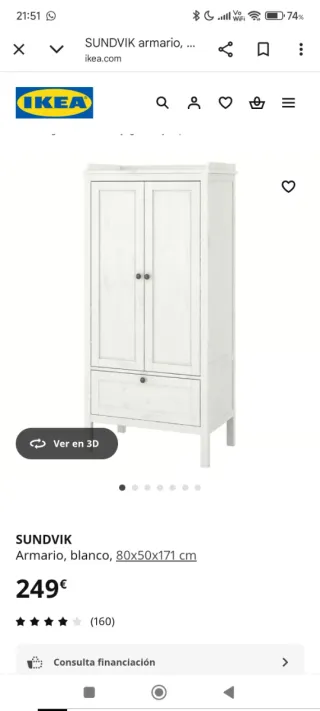 Armario SUNDVIK de IKEA, perfecto para habitaciones infantiles. Sus dimensiones son 80x50x171 cm. - Diseño de dos puertas y un cajón. - Acabado en madera.