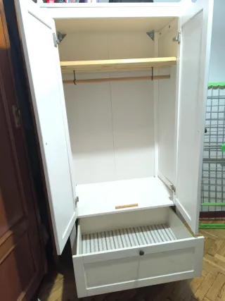 Armario de almacenamiento con un diseño moderno y funcional. - Estructura principal de madera. - Puertas con bisagras. - Estante superior para organización. - Barra para colgar ropa. - Agujeros para ajustar la altura de los estantes. tiene algunos desperfectos todos ellos en las fotos precio negociable