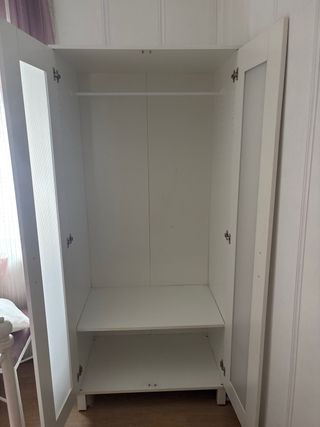 Tengo dos unidades de este armario de dos puertas con acabado en blanco y espejo en las puertas. Se encuentra en muy buen estado. Todas las medidas en la foto final. - Puertas con espejo. - Tiradores metálicos. - Cajón inferior. El precio es por cada armario.