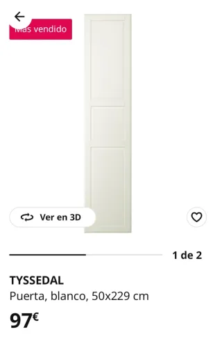 Puerta de armario TYSSEDAL de IKEA en color blanco roto. Sus dimensiones son 50x229 cm. Diseño clásico con paneles. Son dos puertas. Sin bisagras. Compatibles con armario PAX de 236 cm. 10 euros cada una. Venta solo en persona. No hago envíos.