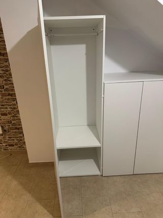 Armario de diseño moderno con puertas correderas. Ikea - Acabado en blanco. - Estructura de madera y metal.