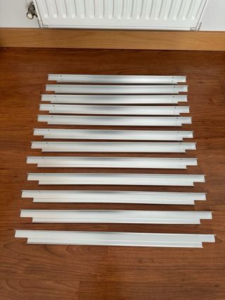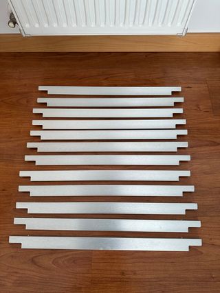 Conjunto de tiradores de la serie BLANKETT de IKEA. Son ideales para dar un toque moderno a tus muebles. - Diseño lineal y elegante. - Acabado aluminio cepillado. - Precio 4e unidad si compras todos. - Dispongo de 8 unidades Se compraron para mueble serie Besta pero no se utilizaron, vale para gran cantidad de modelos de ikea, BESTA, METOD... Tiradores de 595mm. 595mm parte larga 515mm parte corta 480mm entre perforaciones Entrega en Móstoles, priorizo vender el pack.