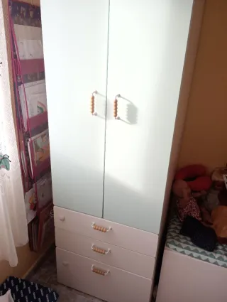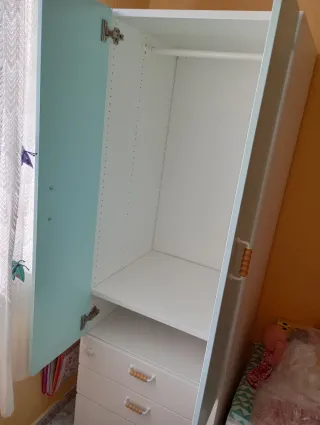 Armario infantil de Ikea con un diseño moderno y funcional. Perfecto para organizar la ropa y juguetes de los más pequeños. - Puertas superiores con tiradores de madera y una balda abajo ( pero se puede mover) - Tres cajones inferiores con tiradores de madera. La parte de arriba es de color turquesa y los cajones de abajo son blancos. El armario de encuentra en buen estado, aunque tiene un pequeño desperfecto en el interior de la puerta que se hizo al colocar los tiradores, el cual puede verse en la foto. Nuevo costó unos 200 euros aproximadamente y tiene 3 años de antigüedad. Para recoger y se entrega montado.
