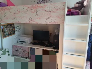 Litera Smastad de IKEA, ideal para optimizar el espacio. - Incluye escritorio y armario. - Escalera lateral para acceder a la cama superior. - Cajones integrados para almacenamiento. Regalo somier. La escalera tiene un tornillo pasado pero se arregla con masilla de carpintería. No la desmonto hasta que no esté pagada o vienes a desmontar. Solo en persona, no gestiono portes.