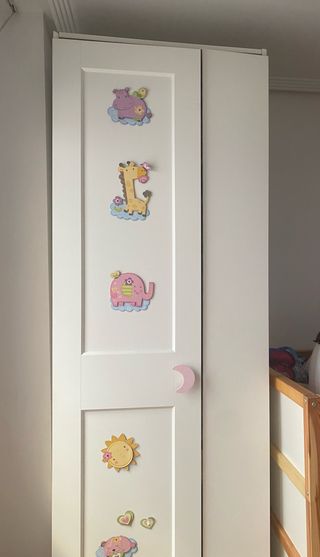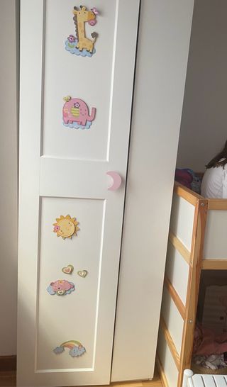 Armario Ikea de la línea PAX con accesorios Komplement. Medidas: Alto 236 cm. Ancho 75 cm. Fondo 58cm. Tiene gran capacidad ocupando poco espacio. Distribución interior a medida, se puede modificar tantas veces se quiera. Posibilidad venta con o sin accesorios komplement. Nuevo me costó más de 240€ Los detalles infantiles se pueden quitar, son solo pegatinas de un punto y el tirador también