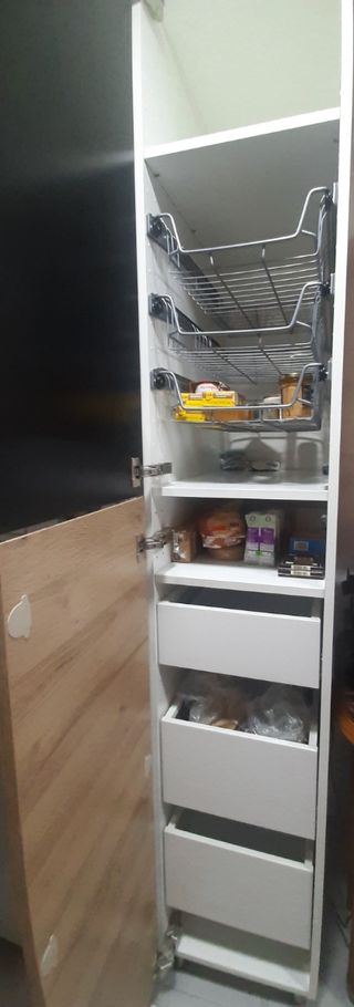 Armario despensero en perfecto estado, con poco uso. - Tres cajones espaciosos. - Estantes de metal para una organización óptima. - Diseño elegante en pizarra y madera. Precio negociable. Preguntar