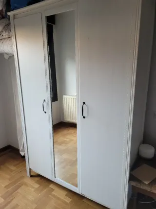 Armario de tres puertas con espejo central. modelo brusali de ikea - Diseño moderno y funcional. - Tiradores negros. - Acabado en madera.