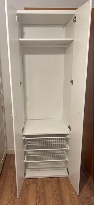 Armario doble de la serie PAX de Ikea Son dos armarios de 200x50x58cm que juntos hacen 200x100x58cm. El precio incluye: - 2 puertas BERGSBO con sus bisagras - 2 tiradores metálicos. - 6 baldas KOMPLEMENT - 3 cajones de rejilla KOMPLEMENT - 1 cajon de madera KOMPLEMENT - 1 barra par colgar ropa En las fotos se ve lo que costaría el armario nuevo con todas las piezas.