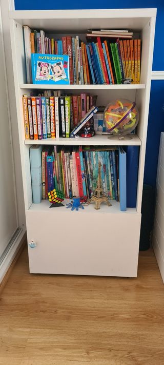 Preciosa estantería infantil de madera, ideal para organizar libros y juguetes. Se encuentra en buen estado. - Perfecta para habitaciones infantiles. - Tres estantes amplios para guardar libros y objetos. - Un armario inferior con puerta. Tiene una puerta también