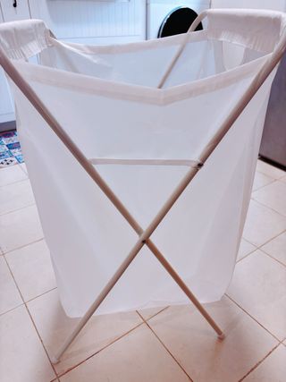 Vendo un bolsa de ropa de lavandería con soporte color blanco marca IKEA. Capacidad 50L. Es ligera y plegable, por lo que se puede acercar a la lavadora, guardar en un armario o colgar de un gancho. Caben hasta 8 kg de ropa. Está como nuevo, impecable.