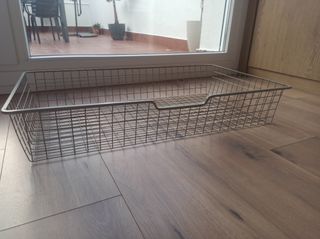 Cesta cajón de metal para armario de Ikea Pax. Tengo 4 cestas de 1 metro de ancho a 10€ cada una, y dos cestas de 50 cm de ancho a 5€ cada una. No incluye rieles, solo los cajones de metal (alguno tiene un poco de óxido). Están en Vigo.