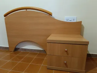 Conjunto de mobiliario para habitación juvenil. - Cabecero de madera con diseño curvo: 150 cm (largo) x 4 cm (grosor) x 93 (parte más alta de la curva) y 66 (el extremo más bajo, junto a la mesilla) - Mesita de noche con dos cajones: 50 cm (ancho) x 41,5 (profundo) x 43,5 (alto) - Armario: 100 (ancho) x 54 (profundo) x 259 cm (alto). Son módulos por lo que la parte alta se puede quitar. - Estantería: 236 (alto) , 24,5 (profundo) x 92 cm (ancho). Se podría montar sólo una columna de estanterías y serían 48 cm de ancho entonces. Hay que venir a recogerlo a l'Ametlla del Vallès.