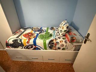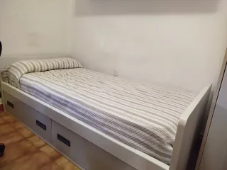 Se vende dormitorio juvenil en buen estado. Incluye cama con cajones, armario y estantería. - Cama individual con dos cajones amplios. - Armario superior con puertas. - Estantería central. - Diseño moderno y funcional. Inclulle colchon