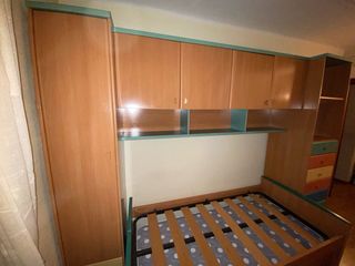 Conjunto de muebles para habitación juvenil. Doble cama; superior 2x1 metro (con colchón, no usado) Inferior 1,90x90 cm. con canapé abatible. Armario inferior de 1 metro de ancho x 1 metro de alto puerta, 55cm ancho, con colgador extraible y 4 cajones, dos sencillos y dos doble de altura, profundidad 90cm Escritorio 120x60, más book. Armario vertical 4 puertas de 36x200cm (Se puede montar como está en foto u otra distribución, ver ejemplo en fotos)