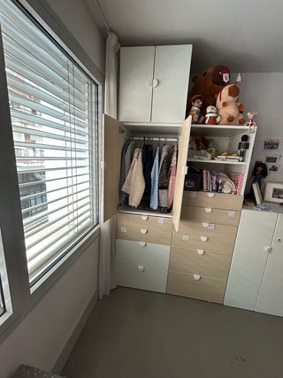 Armario modular de Ikea, ideal para habitaciones infantiles o juveniles. Combina módulos de puertas y cajones para un almacenamiento versátil. - Módulos de puertas en blanco. - Módulos de cajones en acabado madera clara. - Tiradores redondos blancos.