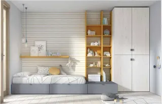 Nueva colección de Nidos y convertibles. Colores de la composición: Nord / Índigo / Mustard. Tirador: Nude. 1 Terminal descalzador con estante izquierda 220. 1 Armario rincón puerta corredera izquierda 40 220. 1 Cama Adapt series 2 studio + 2 cajones 190 x 90. 1 Modulo Colgado diáfano 40 x 34 x 30. 1 Escalera Altura 94 cm. Transporte y montaje en Barcelona hasta 10 kms, incremento opcional. Posibilidad de elegir otras combinaciones de colores (consulte fotos en los muestrarios). Traiga sus medidas y adaptamos una solución a su espacio. NO ENTREGAMOS FUERA DE CATALUNYA. FINANCIAMOS HASTA 12 MESES. Consultas por whatsapp al 672699523
