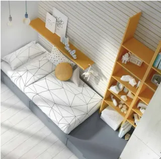 dormitorio marca kivuc compuesto por cama nido hueco para el corchon de 1,86 x 90 y cajones debajo cama mesita noche armario suspendido 2 puertas armario ropa de 2,40 mts de altura x 80 de ancho y 2 estanterias