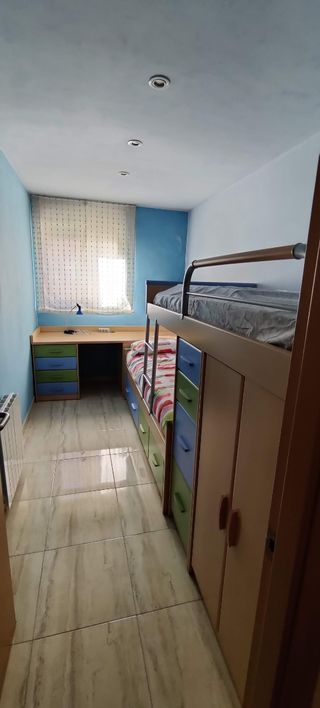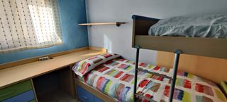 Dormitorio juvenil compuesto de: -Armario 2 puertas 100x195x54 cm -Cama nido: 100x200 cm -Escritorio con arcón: 200x50x75,5 cm -Estante pared: 100x25 cm -Mueble auxiliar: 95x38x105 cm El mueble auxiliar no es del conjunto pero se incluye en el precio En segunda residencia, usado en vacaciones, se cambia para poner literas Se recoge en Sant Carles de la Ràpita.