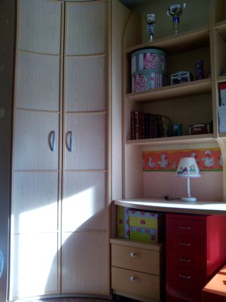 Vendo muebles de habitación juvenil: armario, estantería, mesa y book. El armario es rinconero y tiene mucha capacidad. Medidas: 240 (alto) x 93 x 110 cm. Medidas de la estantería: 164 (alto) x 149 (largo) x 28 cm (fondo). La mesa tiene el lado derecho redondeado y las medidas son: 150 x 56 cm. Mueble book de dos cajones: 47 (alto) x 40 (largo) x 42 cm (fondo). En perfecto estado. Está desmontado, por lo que el transporte es fácil.