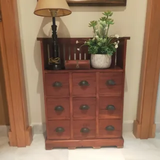 Mueble auxiliar de madera con varios cajones, ideal para recibidor o pasillo. - Estructura de madera. - Tiradores metálicos.