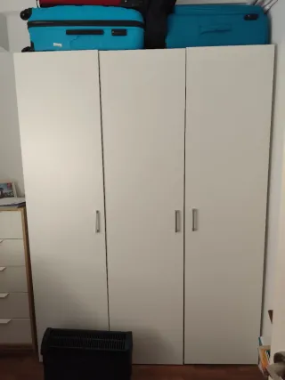 Armario de tres puertas en buen estado, sin daños estructurales: algunas tablas tienwn resto de celo y una de las tablillas del fondo se balancea. Se regala cajonera que se puede ver dentro del armario. - Amplio espacio de almacenamiento. Lo muestro lleno para que se advierta mejor la capacidad. - Blanco con tiradores plateados metal. - Antigüedad: año y medio. Se entrega desmontado. Recogida por cuenta del comprador. Plazo máximo de recogida por mudanza: 18 Febrero