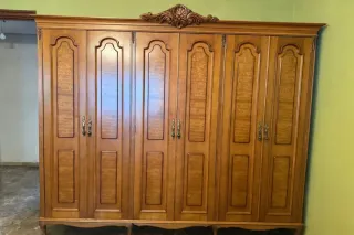 Armario de madera maciza con un diseño clásico y elegante. - Fabricado en madera maciza. - Color marrón cálido. - Diseño de puertas con paneles. - Tiradores metálicos dorados. 2270 mm de largo ➕ 40 mm por cada lado 560 mm profundo ➕ 50 mm 1960 mm de alto ➕ 100 mm