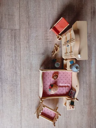 Conjunto de muebles de madera para dormitorio de casa de muñecas. - Armario de madera con puertas. - Cama con colcha rosa y detalles de corazón. - Mesita de noche con lámpara. - Cuna mecedora a juego. - Tumbona roja. - Cesta de mimbre. - Perchas de madera. - Sombrero - calentador agua caliente -libros