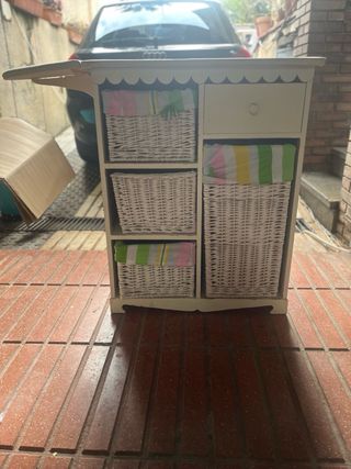 Mueble organizador con seis cestos. - Estructura de madera color blanco. - Cestos de mimbre con forro interior color azul intenso. Está muy bien conservado, la zona de arriba un poco desgastada la pintura (ver foto) pero el resto perfecto. Gran capacidad. Medidas mueble : ancho 63, altura 73 y profundidad 32. Cestas pequeñas: ancho 17, largo 26 y altura 18,5 cm Cestas medianas: ancho 25,5, largo 27 y altura 18,5 cm Cesta grande : ancho 55,5 , largo 27 y altura 18,5 cm.