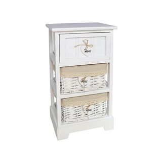 Práctica cajonera de tres niveles con un diseño que imita el mimbre. - Tres cajones espaciosos. - Acabado blanco que combina con cualquier decoración. - Estructura ligera y fácil de mover.