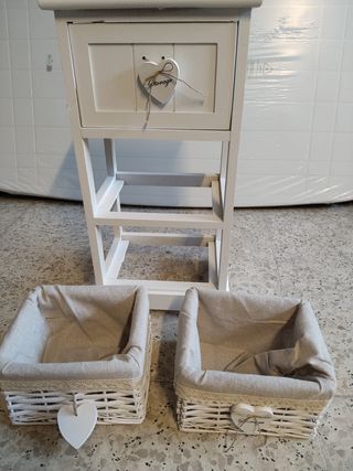 Mueble auxiliar con un diseño encantador, perfecto para añadir un toque acogedor a tu hogar. Combina funcionalidad y estilo. - Estructura principal de madera. - Tres cestas de mimbre con forro de tela. - Detalle decorativo de corazón con la palabra Home en el cajón superior. - Acabado en color blanco y beige. Estos artículos son devoluciones de tienda que tienen algún defecto o desperfecto que no afecta con su funcionalidad por tal motivo es el precio. Se entrega como se ve en las fotos, y su recogida es la tienda, NO SE REALIZAN ENVÍOS DE ESTE ARTÍCULO. Cualquier información adicional comunícate con nosotros.