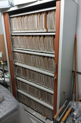 Armario archivador metálico con puertas correderas y cerradura. - Estructura robusta. - Amplio espacio interior para carpetas y documentos. - Diseño funcional para oficinas o despachos.