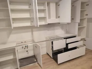 Conjunto de armarios de cocina modernos y funcionales. Muebles nuevos. A estrenar con montaje y campana extractora incluida. - Diseño limpio y minimalista. - Acabado brillante. - Amplio espacio de almacenamiento. Sí tienes otra medidas en tu cocina contacta con nosotros y te haremos presupuesto sin compromiso tel 644177840