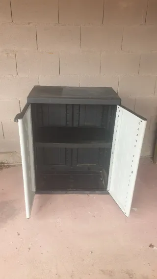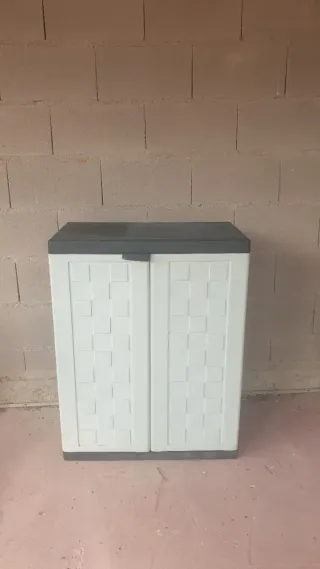 Armario de exterior con un diseño moderno y funcional. Perfecto para organizar tus herramientas y accesorios de jardín. - Estructura resistente a la intemperie. - Dos niveles de almacenamiento - Se encuentra montado - 35€ el conjunto de los 2 armarios