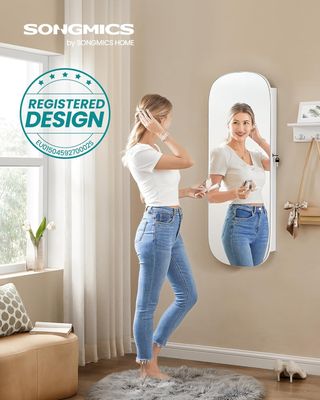 [Moderno y decorativo] Espejo redondeado para un efecto flotante. [Dimensiones] 10 x 42 x 108 cm, peso 9,9 kg. [Materiales] MDF, terciopelo, vidrio. [Capacidad] Contiene pendientes, collares, anillos y herramientas de maquillaje. [Seguridad] Cierre con 2 llaves para proteger las joyas. [Funcionalidad] Espejo interno con luz LED para maquillarse fácilmente. [Alturas ajustables] Dos opciones de montaje. [Contenido] Incluye armario, bolsa con herramientas de montaje y manual. [Nota] No colocar en ambientes húmedos. Diseño patentado, n. EU0150459270002S.
