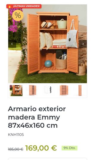 Medidas 87x46x160cm. Madera de pino tratada. Espesor panel 10mm. Peso 23,5kg. Color madera natural. Armario exterior de madera Gardiun Emmy ideal para organizar herramientas, productos de limpieza y accesorios de jardín. Incorpora tres compartimentos de diferentes tamaños que facilitan el almacenamiento ordenado. Puerta abatible de doble hoja tipo persiana para mejor ventilación y acceso cómodo. Techo plano protegido con tela asfáltica para mayor resistencia a la humedad. Fabricado en pino tratado con dos capas de pintura al agua, apto para exterior en zonas cubiertas. Montaje en 2 bultos.