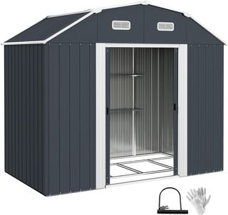 Caseta De Jardín 2.6M² De Acero Galvanizado Con 2 Salidas De Aire Y Ventana Transparente, Cobertizo Para Herramientas Con Techo Inclinado, Puerta Con Cerradura, Impermeable Y Anti UV, Gris Oscuro