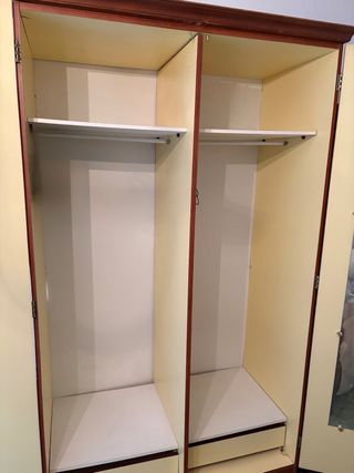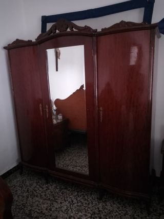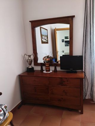 Conjunto de muebles de dormitorio de madera. - Armario de seis puertas con espejos centrales 170€ - Cómoda a juego 90€ - Dos mesitas de noche 45€ cada una Se vende también por separado