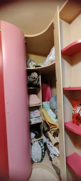 Me gustaria vender este armario de rincón. Es un mueble de madera con un diseño muy bonito. - El armario es de color rosa y beige. - Tiene un diseño de rincón que aprovecha el espacio. - Perfecto para cualquier habitación.