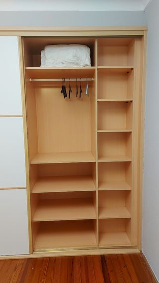 Armario empotrado Ancho: 248 cm Profundidad: 68cm Altura: 240cm Fondo estanteria grande: 57cm Fondo estantería pequeña (lateral derecho): 25cm Ancho estantería pequeña: 38 cm Esta en buen estado. Se quita por reforma de habitación. El desmontaje y el transporte corre a cargo del comprador.