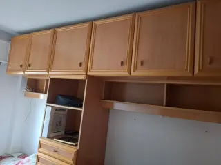Conjunto de muebles de madera para dormitorio, compuesto de armario, mueble superior con compartimentos y estantería. La cama (somier, colchón y almohada) también se vende, por 50€ más. Medidas armario: 240 (alto) x 48 (costado) x 60 (ancho) cm Medidas mueble alto: 203 (ancho total, hasta estantería) cm Medidas estantería: 82 (ancho) x 30 (fondo) x 202 (alto) cm Medidas cama: 90 (ancho) x 190 (largo) cm También se podría vender solo la estantería, por 30€. IMPORTANTE: No se ayuda a desmontar ningún mueble, no se prestan herramientas para desmontar ningún mueble y no se ayuda a bajarlos. Se encuentra en un octavo con ascensor