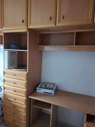 Conjunto de muebles de madera para dormitorio. Incluye armarios superiores y estanterías. - Acabado en madera clara. - Diseño modular adaptable. - Tiradores discretos. NECESITO QUE VENGAN A DESMONTARLO Y SE LO LLEVE QUIEN LO NECESITE. PRECIO SIMBOLICO DE 50 EUROS