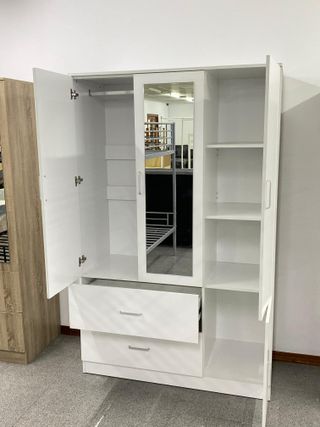 680*558*196 ☎️ Armario ropero de 3 puertas con espejo central y 2 amplios cajones inferiores. Diseño moderno y funcional, ideal para dormitorio, habitación juvenil o de invitados. Disponible en color blanco mate o roble natural, fabricado con materiales resistentes y herrajes metálicos de alta calidad. 📏 Medidas: -Alto: 190 cm -Largo: 120 cm -Ancho: 50 cm 🪞 Incluye espejo en la puerta central