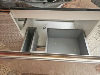 Mueble de lavabo para baño en colores blanco y negro. Está en buenas condiciones. - Diseño moderno y elegante. - Incluye un cajón y un armario con estantes. - Perfecto para baños pequeños o medianos.se vende junto a espejo y lavabo de cristal negro ,y grifo de la marca roca