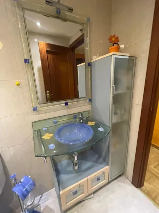 Lavabo precioso de baño, y armario, a recoger en Peñaranda de Brte, Salamanca.Pequeñisima muesca en el cristal lavabo como se ve en foto. De ahi su precio. Solo la parte de abajo, espejo no diaponible .