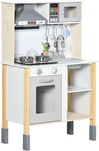 HOMCOM Cocina Juguete para Niños Con Altura Regulable, Efectos Sonoros, Luces Y Utensilios, en MDF Y PP, 60X30.5X93.2 Cm, Gris Y Blanco