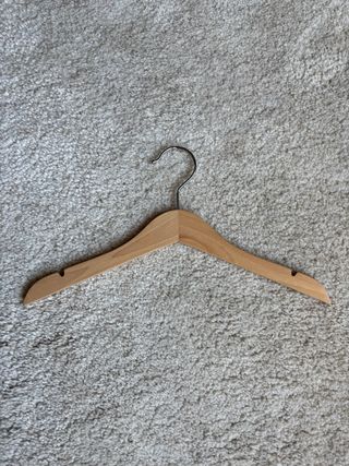 Percha de madera para ropa infantil, color beige. Ideal para organizar el armario de los más pequeños. 11 perchas 10€ - Diseño ligero y resistente. - Gancho metálico.