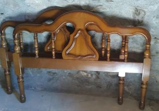 Conjunto de muebles de madera para dormitorio. Incluye armario, cama con cabecero decorado, mesita de noche y escritorio con silla. Se conserva en buen estado. - Armario de madera con puertas y cajones. - Cama individual con cabecero de madera tallada y pintada. - Mesita de noche a juego. - Escritorio con silla. ❓️ Preguntar por más detalles