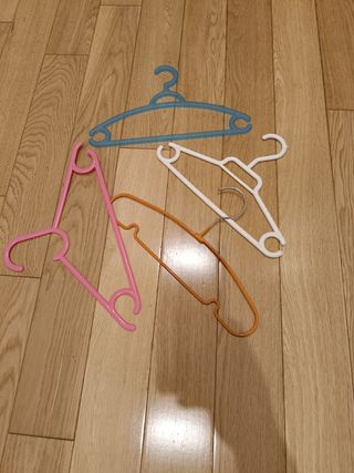 Conjunto de cuatro perchas diseñadas para ropa infantil. Son ligeras y prácticas para organizar el armario de los más pequeños. - Fabricadas en plástico resistente. - Diseño colorido y funcional.